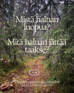 Marraskuun pimeys kutsuu meidät naiset kokoontumaan yhteiseen piiriin, viisaiden naisten neuvostoon. Neuvostossa käännymme kohti sisimpäämme ja tutkimme, mistä olisi aika päästää irti, mistä haluaisin vapautua, mitä et enää halua kuljettaa mukanasi. Yhdessä ja yksin työskennellen tuomme näkyväksi sen, mikä on palvellut meitä ja mistä voimme luopua.
